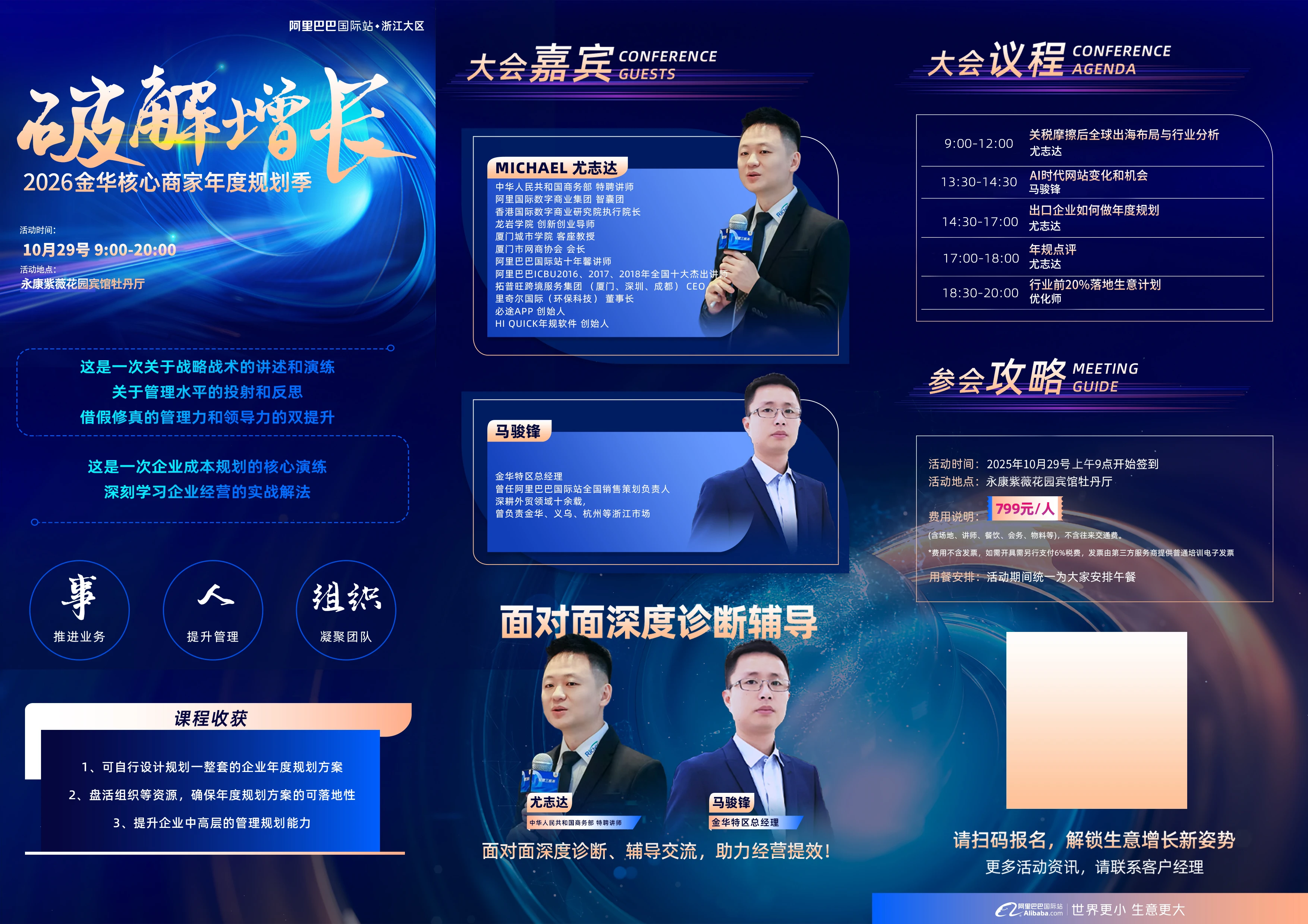 核心亮点: 1.组织机制 管理体系-外贸团队搭建及薪酬绩效设议 2.企业增长引爆增量-营销八大思维升级 3.标杆商家的流量方法论-明星商家分享企业经营之道 4.商圈组建-本地商圈搭建&资源深度链接